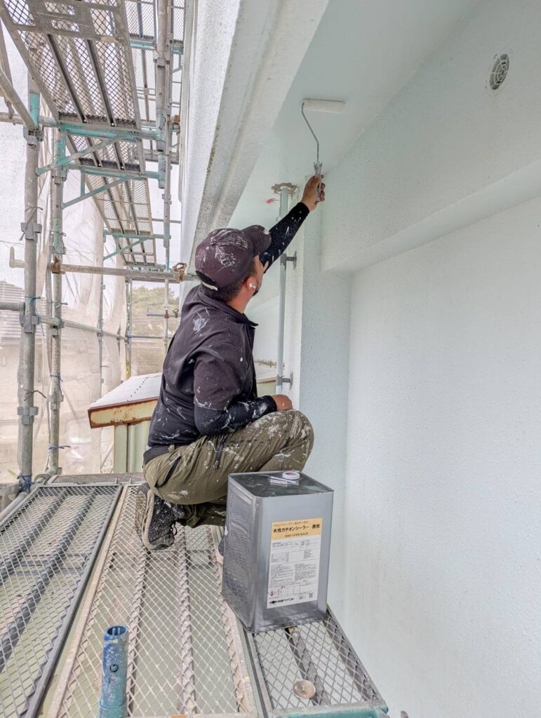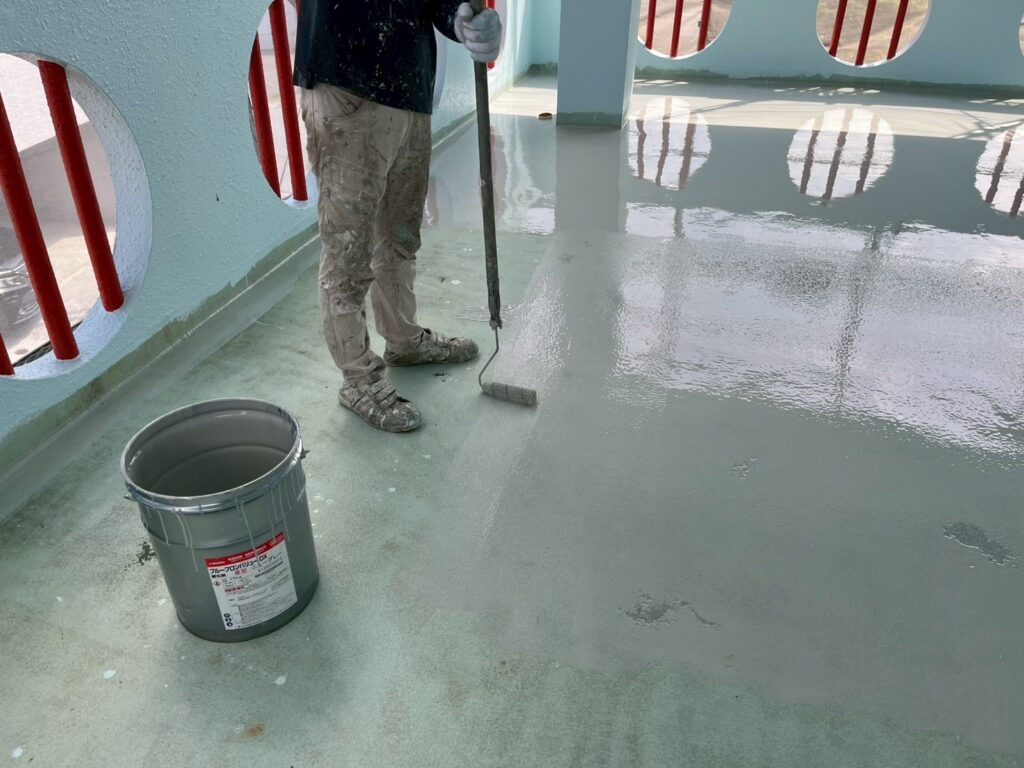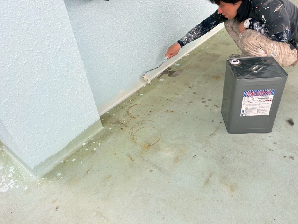 通常ならプライマーを用いますが、今回の屋上は防水層の内側が悪さしており、再発リスクを回避するために「レジアンダー」を選択しました。