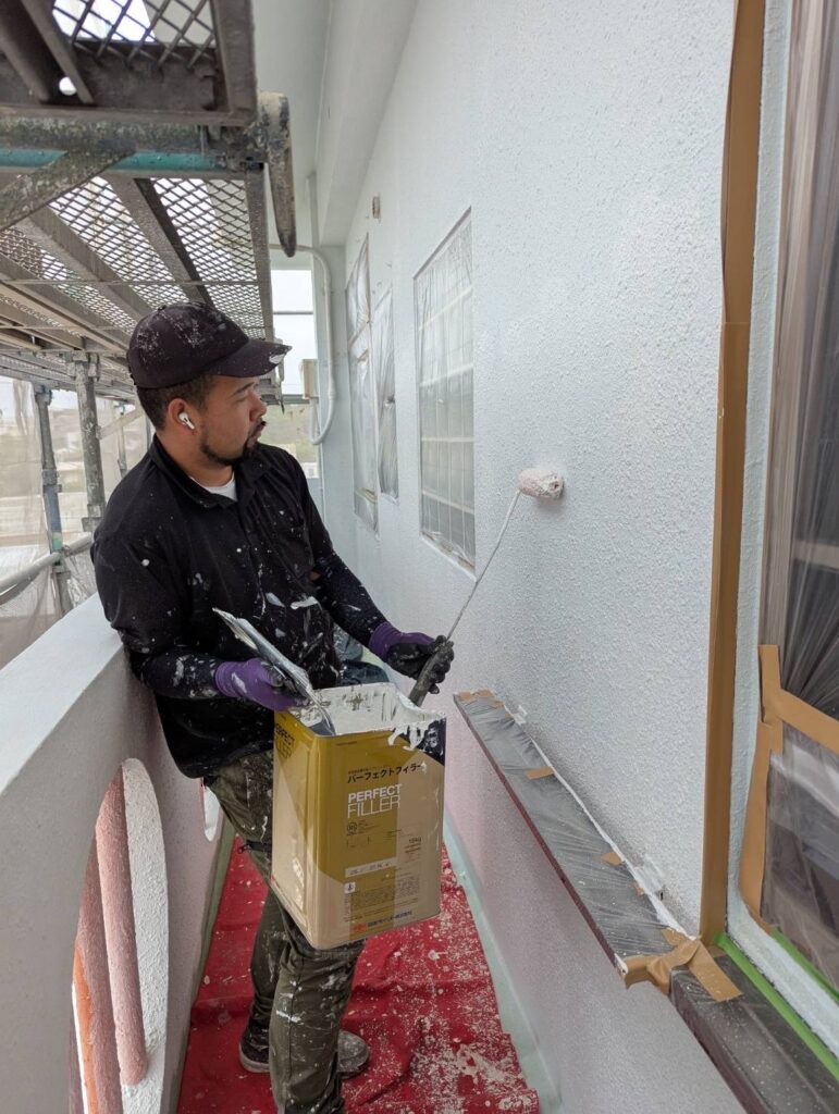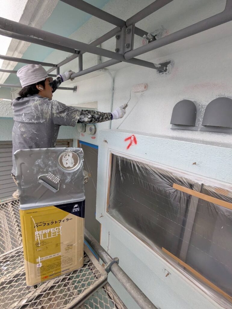 パーフェクトフィーラー:ひび割れや凹凸のある外壁下地をなめらかに整える下塗り材。パーフェクトシリーズの密着性と防水性を支えます。