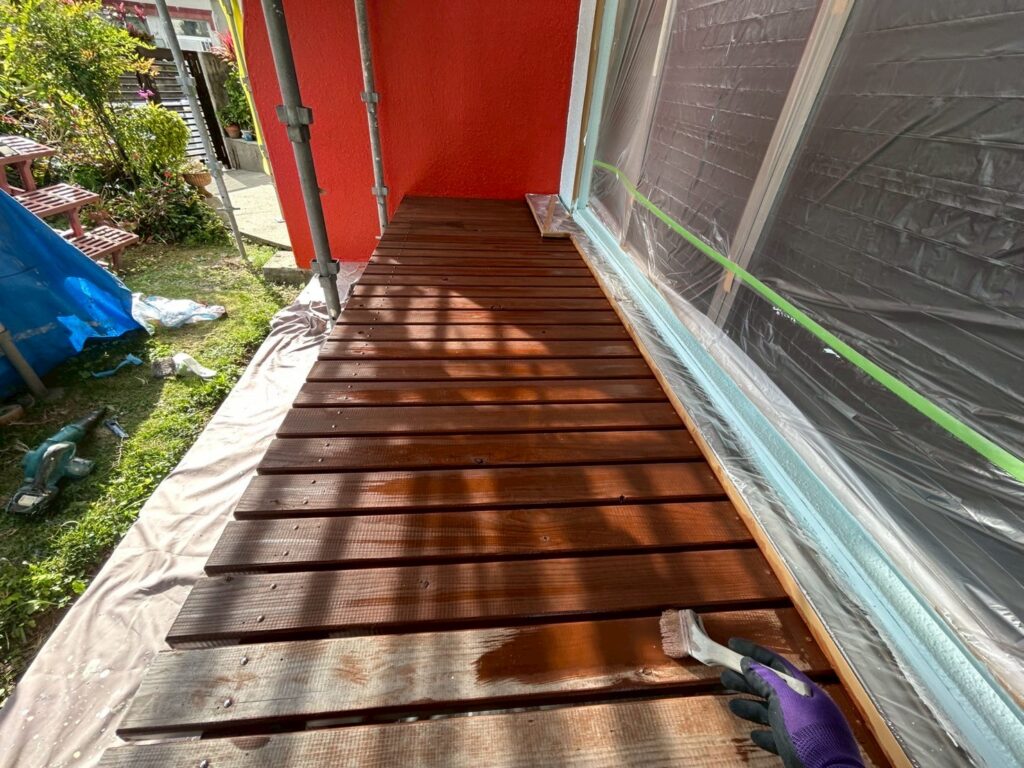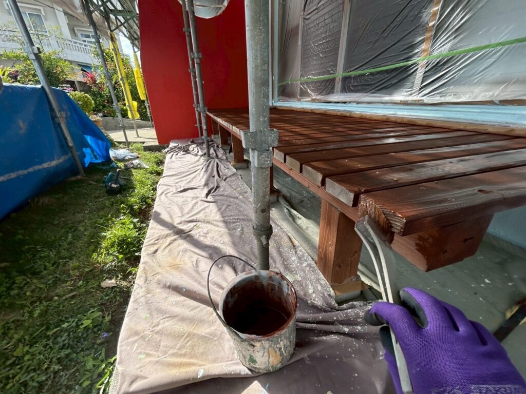 縁側には、防虫・防腐効果のある「キシラデコール」を2度塗り。見た目もぐっと引き締まり、長持ちします。
